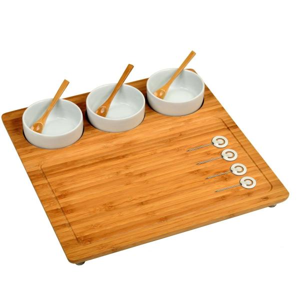 Eco-friendly Bamboo Cheese Board Includes 3 Ceramic Bowls Spoons and Cheese Markers